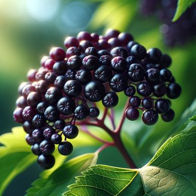 Elderberry refers to several varieties of the Sambucus tree, a genus that includes species commonly found in various parts of the world, including North America and Europe. The most widely known species is Sambucus nigra, or the black elderberry, renowned for its medicinal properties and culinary uses. Elderberries are small, dark purple to black berries that grow in clusters. They are rich in vitamins (notably vitamin C), antioxidants, and flavonoids, making them highly valued for boosting the immune system and for use in traditional and modern remedies against colds and flu.