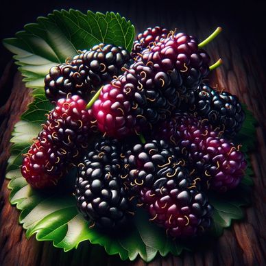 Mulberries resemble elongated raspberries and come in various colors, ranging from white or green when unripe to red, purple, or almost black when ripe. They have a sweet, slightly tart flavor, making them excellent for eating fresh, as well as for use in jams, desserts, and wines. The trees can grow quite large, offering a dense canopy of broad leaves, which also serve as food for silkworms, particularly the leaves of the white mulberry.